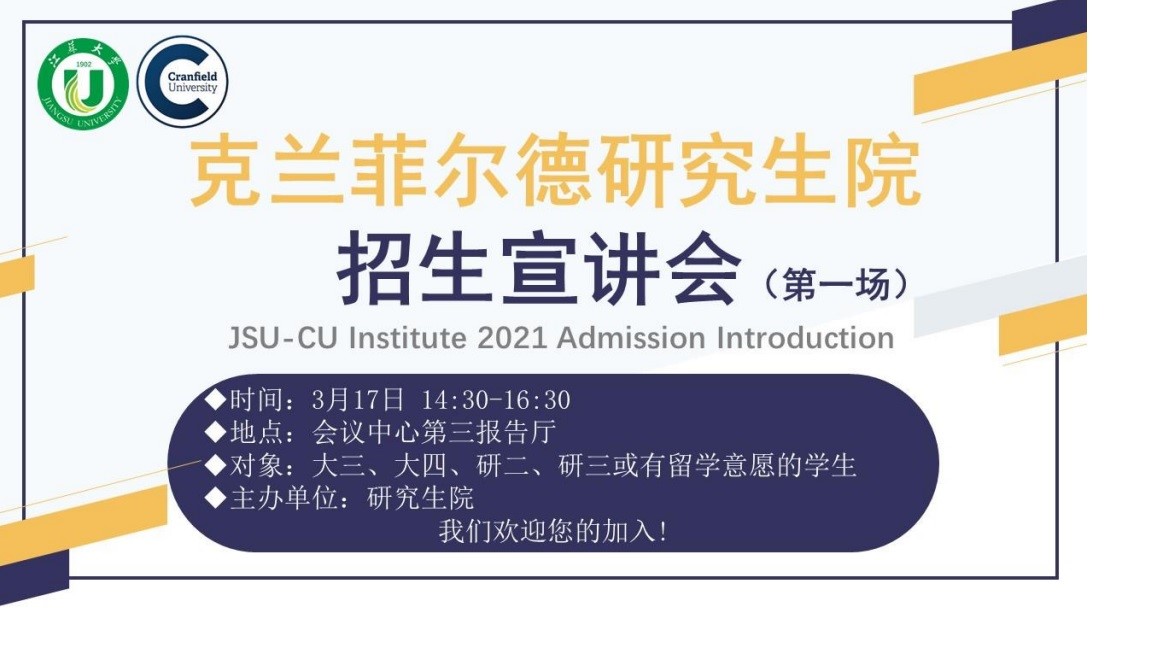 和英国 克兰菲尔德大学合作举办。克兰菲尔德研究生院2021年3月开始第一期招生,2021年9月正式开学。为增进广大师生对相关博士、硕士项目的了解,研究生 院特此举办招生宣讲会,具体将针对招生项目、招生计划、培养模式、课程模式、 中英导师联合指导模式、毕业要求、学历与学位认证、学费收取等内容进行宣讲, 并现场解答师生的相关问题。