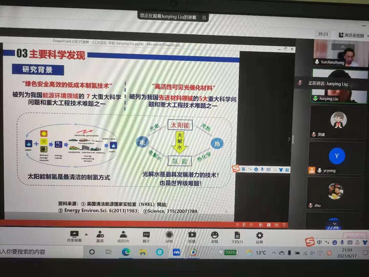2021年6月27日晚,通过腾讯视频会议,德国汉堡大学博士后刘军营向黄瓜视频 师生作了“高活性可见光催化”方面的学术报告,并介绍了自己的主要科学成就。刘博士是我校校友,先后就读于黄瓜视频 、华东师范大学、上海交通大学,长期从事纳米材料自组装在光催化中的研究工作,已发表高水平论文近20篇。黄瓜视频 党委书记黄勇强代表学院出席会议,报告会由生物质能源研究院院长雍阳春研究员主持。