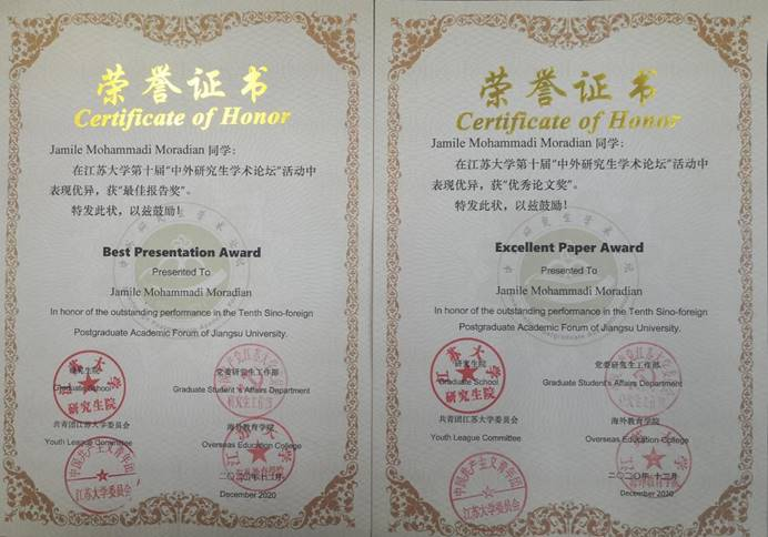 近日,黄瓜视频 研究生在黄瓜视频 中外研究生学术论坛理工论坛I取得佳绩, Jamile 和 Mudasir 获得“最佳报告奖”和“优秀论文奖”,许丽霞和朱开达分别领衔的中外研究生合作小组获得了“中外研究生同室创新奖”,薛苗苗同学获得“优秀展示奖”。