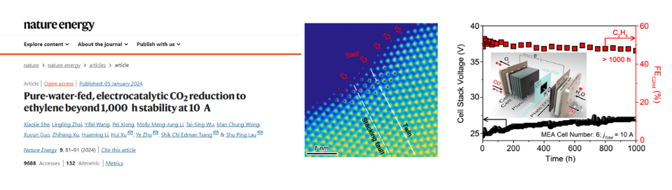 可再生能源驱动的电催化CO2还原技术(ECO2R)作为“双碳”背景下重要的资源化利用技术,因其可产生高附加值化学品、实现碳循环,减少温室气体排放等优势而受到广泛关注。该研究论文针对CO2电解还原系统中碳酸盐形成、电解质损失等难题,致力于提高电催化CO2还原系统的稳定性、耐久性,通过构建高性能的晶界与堆垛层错型Cu基催化剂,从而强化了C-C偶联反应,在流动相电解池中乙烯产物的选择性突破80%;同时研制出以纯水供给的膜电极系统,最终实现了ECO2R系统在工况下长达1000小时的稳定性,并且无CO2和电解质的损失,有效解决了困扰ECO2R领域的碳酸盐沉积问题。该研究工作有力推动了电催化CO2还原技术的实际应用,并和相关企业积极推进产业化落地。