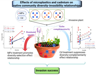 在当前全球化的背景下,生物入侵已成为威胁生物多样性、破坏生态平衡及造成经济损失的主要因素之一。Elton的"多样性-入侵性"假说认为,具有高生物多样性的群落相较于低生物多样性群落能更有效地抵抗外来物种的入侵。然而,这项假设在面对环境异质性和环境污染干扰时,仍然存在争议。本研究考察了微塑料和镉两种污染物如何影响本地群落多样性对入侵物种的抵抗力,揭示了污染物可能通过改变本地群落的互补和选择效应来影响入侵成功的新机制。