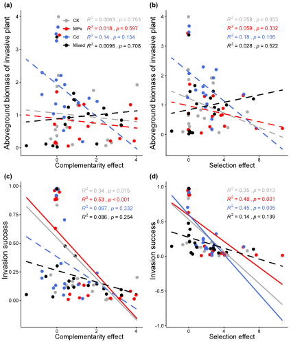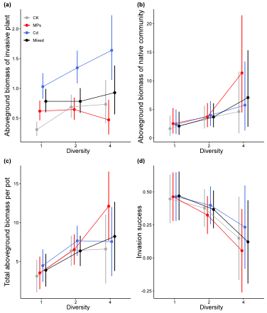 研究结果表明,微塑料和镉的不同处理改变了外来植物对本地群落的入侵成功,并且这种效应取决于污染物的类型。微塑料单独处理减少了入侵成功,且随着本地群落多样性的增加,减少幅度更大;而镉单独处理则增加了入侵植物的地上生物量和入侵成功。但微塑料的存在抑制了镉对入侵成功的贡献。