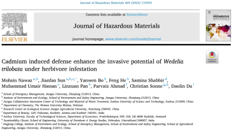 环境生态与修复团队孙见凡老师在Journal of Hazardous Materials (IF: 13.6)上发表最新研究成果“Cadmium induced defense enhance the invasive potential of Wedelia trilobata under herbivore infestation”。黄瓜视频