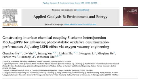 环境健康与生态安全研究中心荀苏杭老师在环境与能源TOP期刊《Applied Catalysis B: Environment and Energy》(SCI一区,IF = 22.1)上发表最新研究论文“Constructing interface chemical coupling S-scheme heterojunction MoO3-x@PPy for enhancing photocatalytic oxidative desulfurization performance: Adjusting LSPR effect via oxygen vacancy engineering”。黄瓜视频