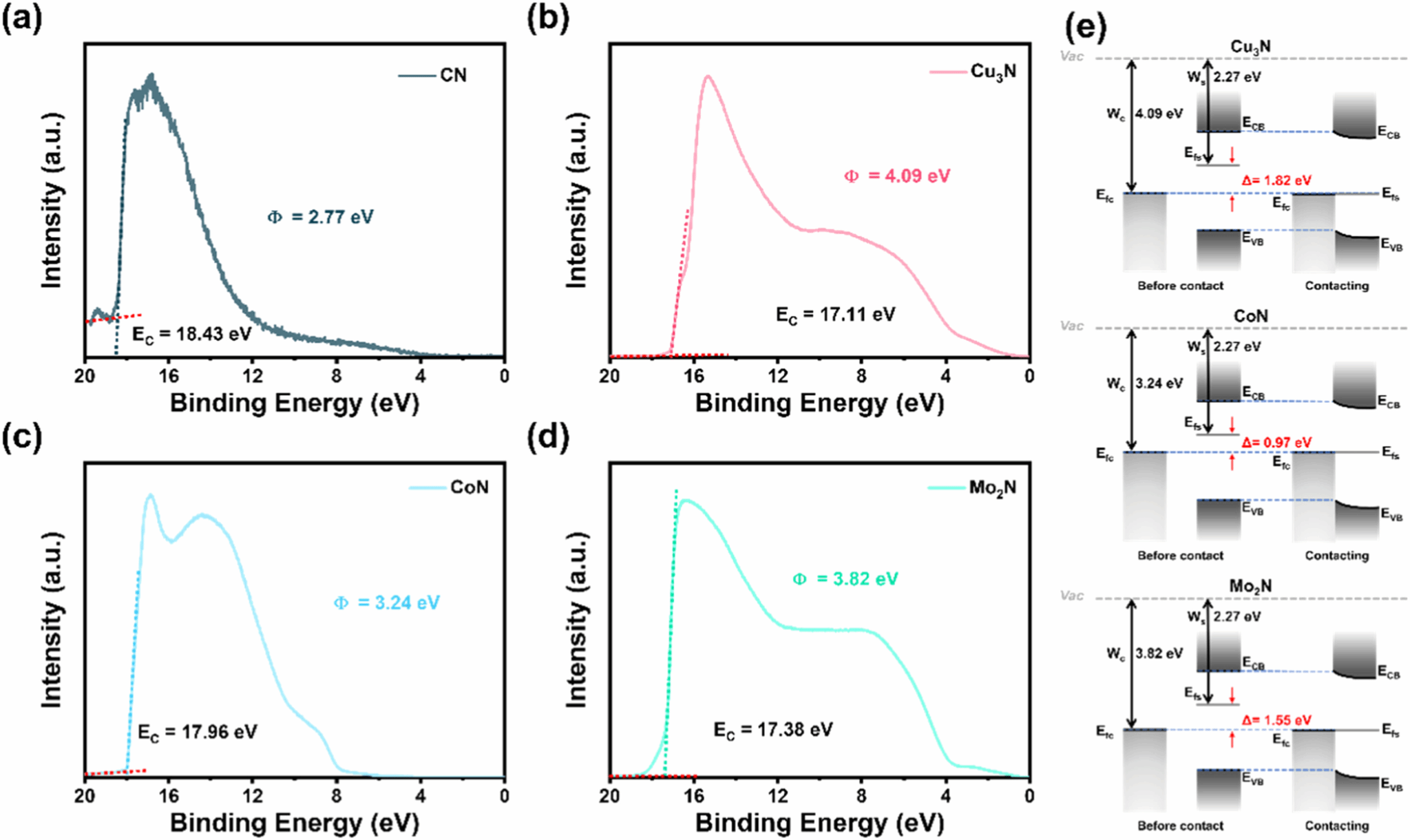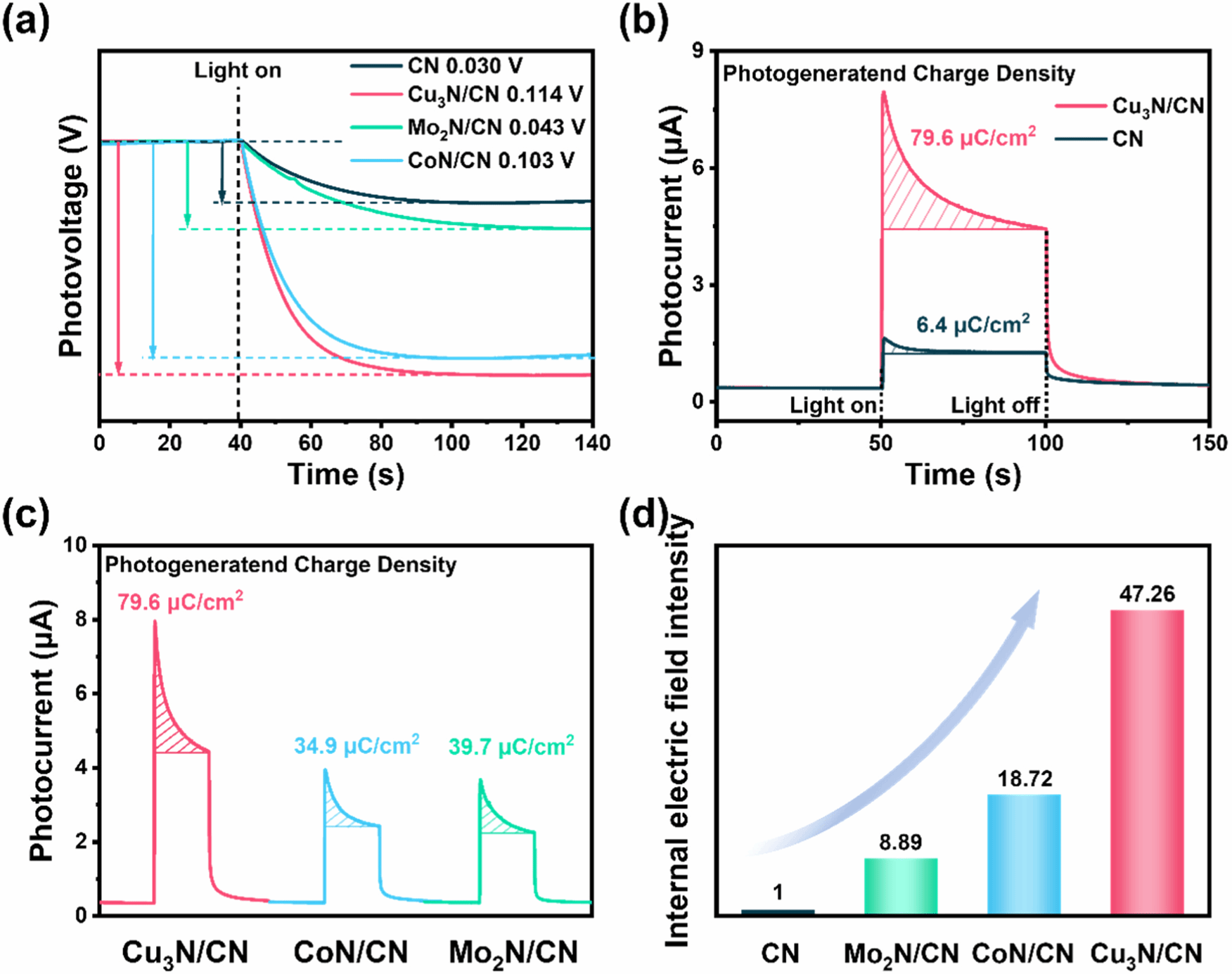 虽然Cu3N的本征催化活性低于CoN和Mo2N,但观察到与CN复合后形成最强的界面电场(IEF),从而在IEF的作用下促进载流子分离,进而提高催化活性。Cu3N/CN的催化活性是纯CN的99.4倍。