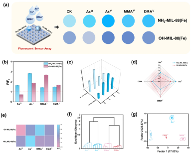 图 2. 基于NH2-MIL-88 (Fe)和 OH-MIL-88 (Fe) 的荧光传感器阵列构建及砷形态快速识别