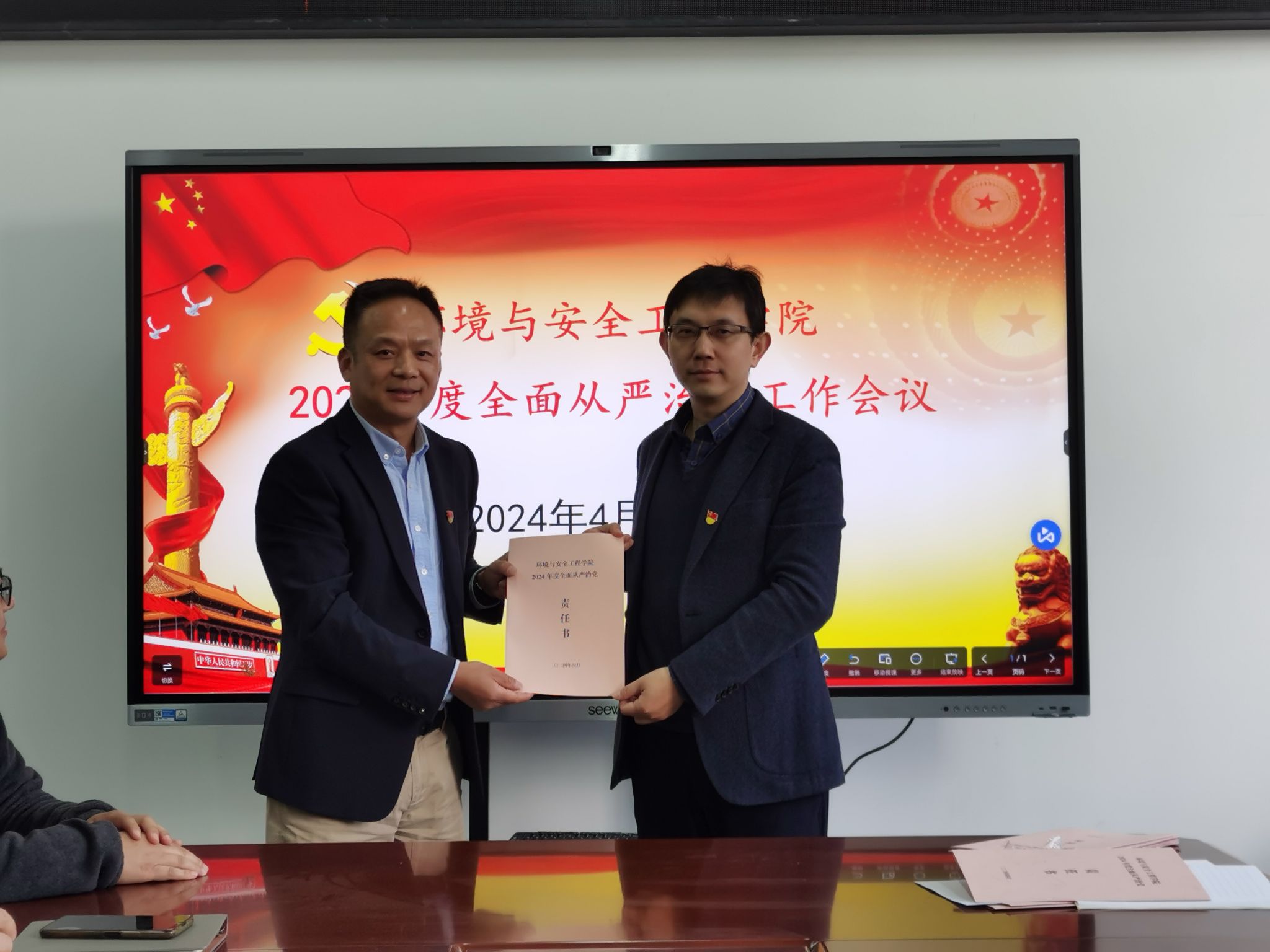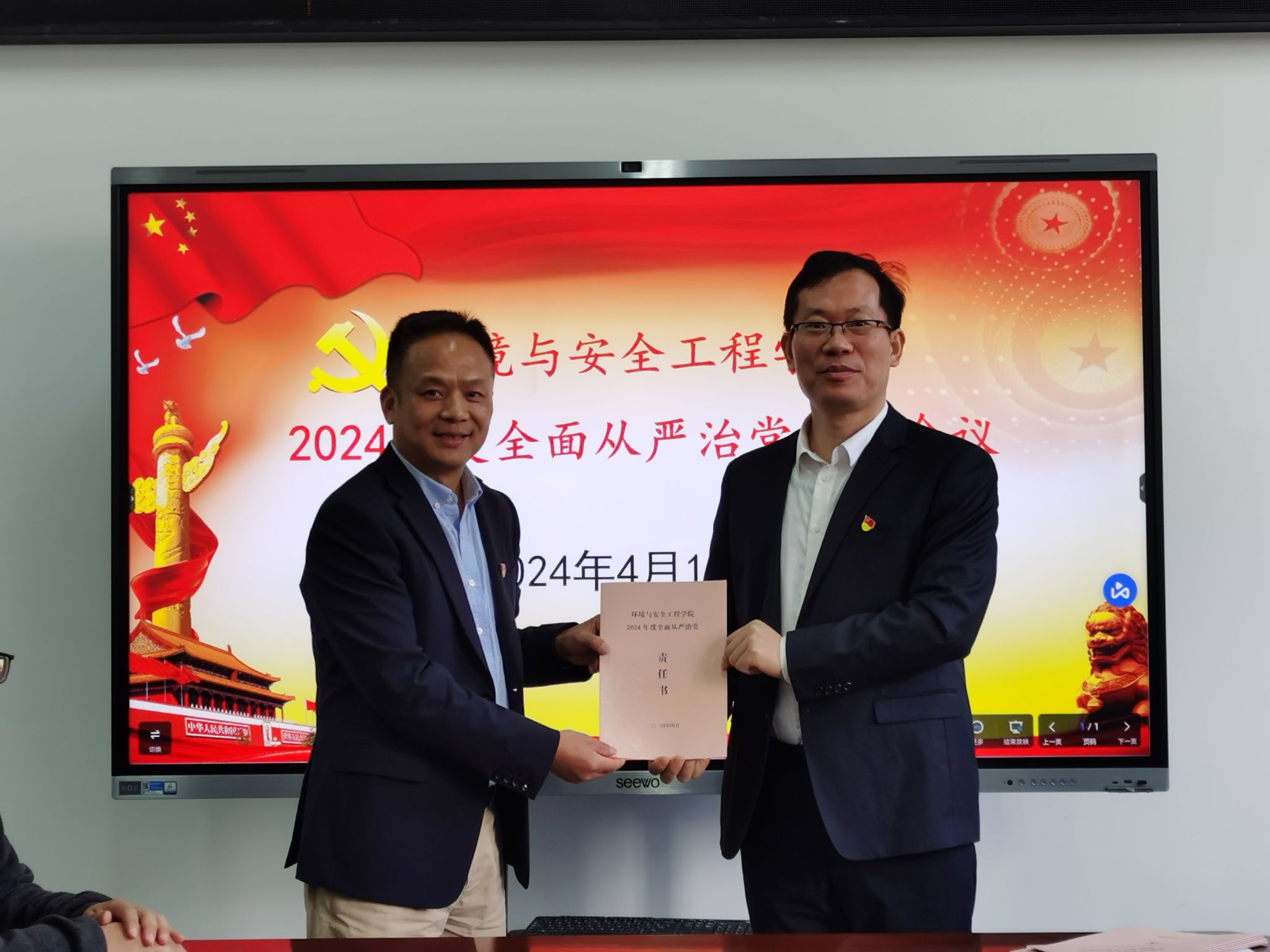 2024年度落实全面从严治党党委主体责任清单》。领导班子代表、教职工党支部书记代表、学生党支部书记代表分别向院党委递交了2024年度全面从严治党主体责任书。学院党委副书记兼纪检委员赵兴联同志从六个方面总结了学院2023年度全面从严治党和党风廉政建设工作。